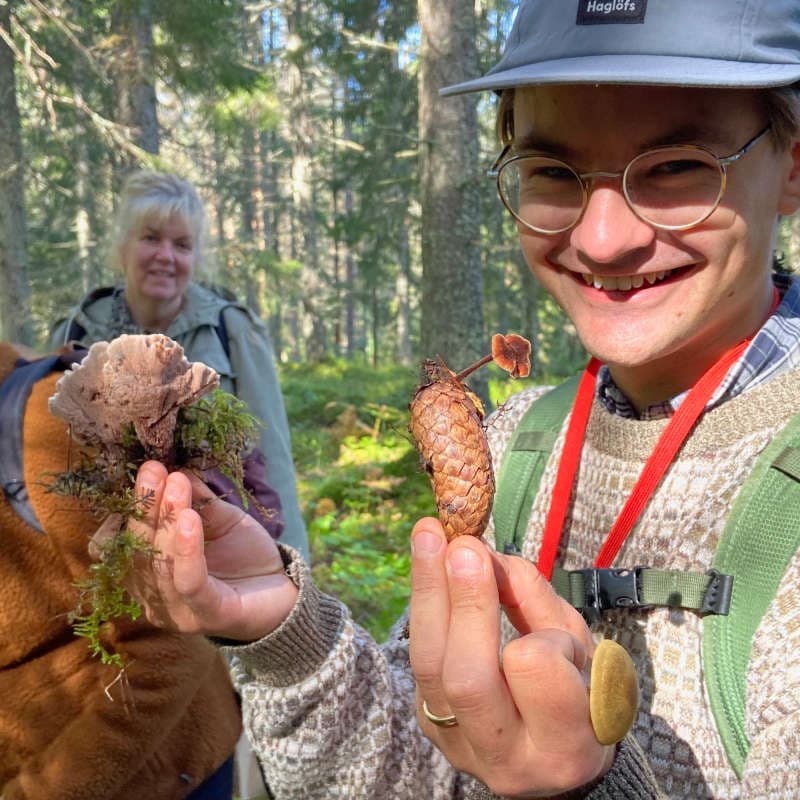 Efter en torr start på svampsäsongen i Roslagen 2025 hade svamparna äntligen dykt upp efter några nederbördsrika veckor – och det med besked! Denna soliga septembermorgon, närmare bestämt den 13 september, samlades vi nio entusiaster från Naturskyddsföreningen Roslagen och Roslagens Ornitologiska Förening på Friskisparkeringen för att bege oss till en utlovat artrik kalkbarrskog. Redan på parkeringen började insamlade och medtagna svampar att artbestämmas och diskuteras som ett smakprov av vad dagen hade att bjuda. Målet för dagens exkursion var en frivilligt skyddad gammal luckig f.d. betesskog utanför Ununge. Efter många kilometer på allt krokigare och guppigare vägar kom vi slutligen fram till skogsskiftet och svampkännaren Johan, tillika markägare, med likaledes svampkunniga barn mötte upp. Efter bara några minuter hade vi fått se globala rariteter såsom raggtaggsvamp och grangråticka och artlistan växte sedan lika snabbt som svampkorgarna fylldes med kantareller, rödgul trumpetsvamp och svart trumpetsvamp. Korallfingersvampar, ädelspindlingar och taggsvampar av alla dess slag examinerades och artbestämdes med doft, smak, kemiska färgreaktioner och så vidare.